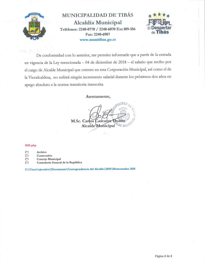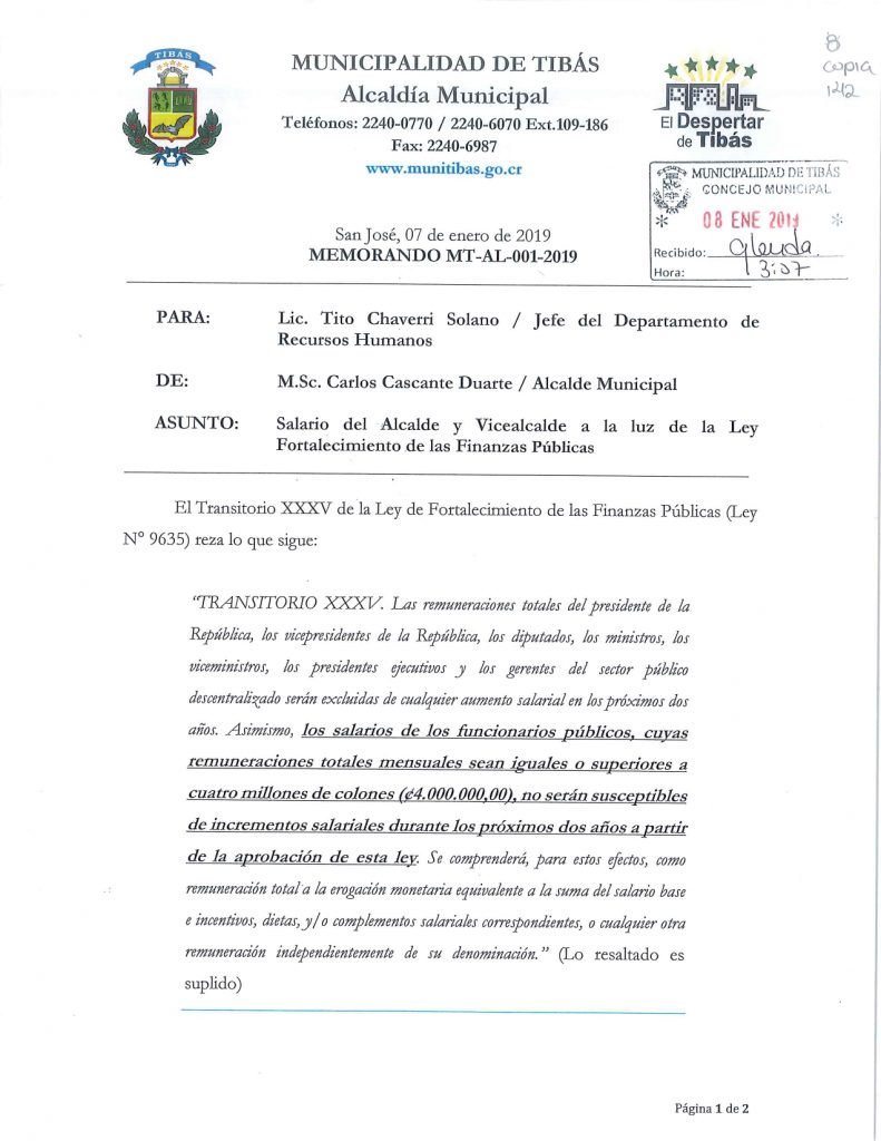 En el Memorando MT-AL-001-2019, enviado el 07 de enero del 2019 al Departamento de Recursos Humanos de la Municipalidad de Tibás se lee: “… me permito informarle que a partir de la entrada en vigencia de la Ley mencionada, el salario que recibo por el cargo de Alcalde Municipal, así como el de la vicealcaldesa, no sufrirá ningún incremento salarial durante los próximos dos años en apego absoluto a la norma transitoria…”.