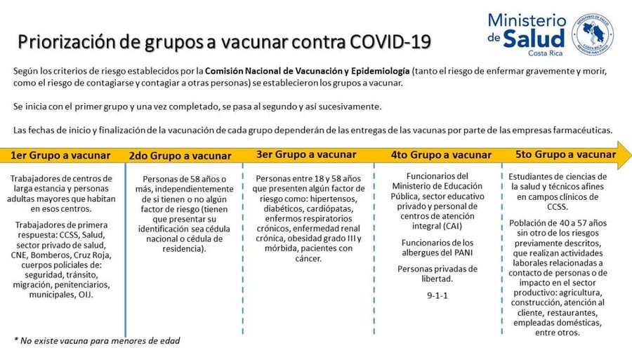 San José, 18 dic (elmundo.cr) – El Ministerio de Salud dio a conocer la priorización de los grupos para la aplicación de la vacuna contra el Covid-19.