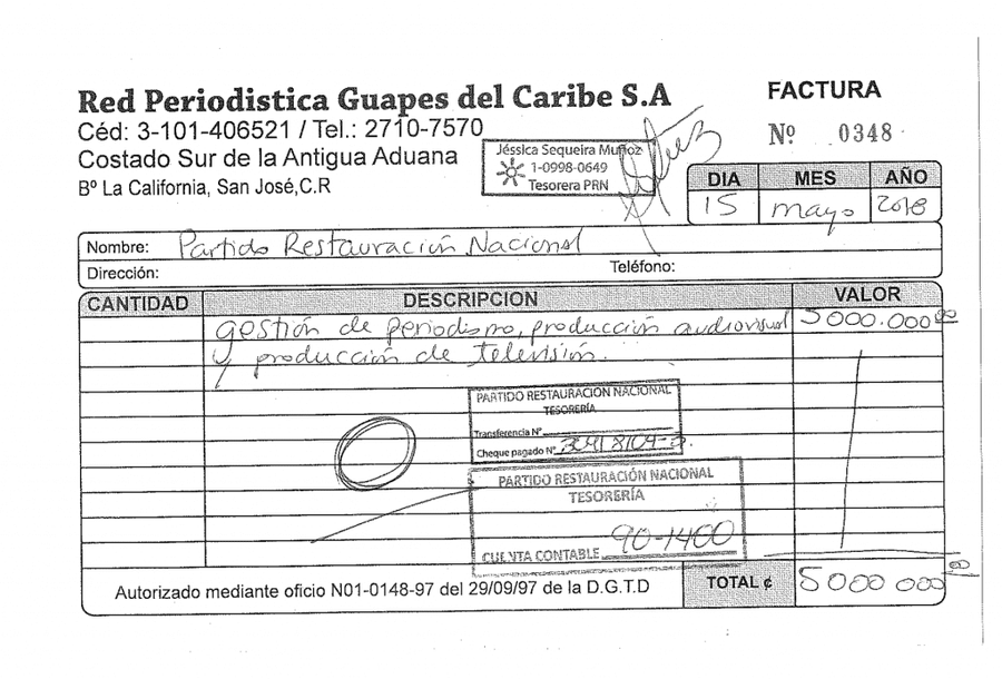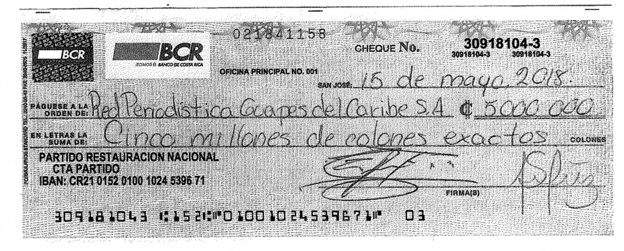 En la liquidación final de gastos del Partido Restauración Nacional presentada ante el TSE se puede ver un pago de cinco millones de colones a la empresa Red Periodística Guapes del Caribe S.A., del comunicador Camilo Rodríguez.