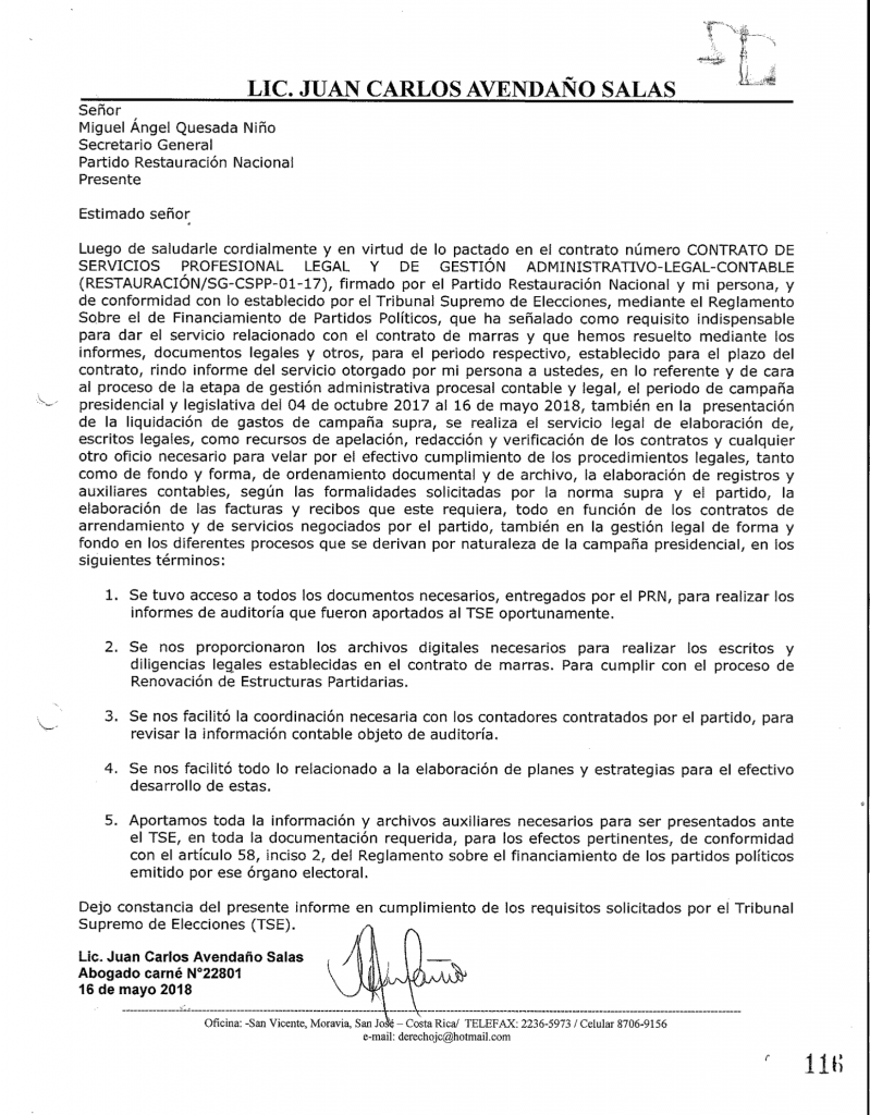En el informe de labores presentado por Juan Carlos Avendaño, detalla que “se nos proporcionaron los archivos digitales necesarios para realizar los escritos y diligencias legales establecidas en e contrato de marras. Para cumplir con el proceso de Renovación de Estructuras Partidarias”.