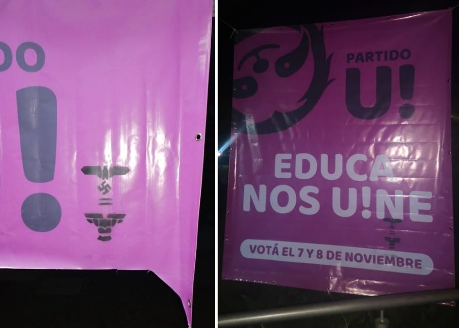 San José, 9 nov (elmundo.cr) – Los miembros del partido federativo U Factorial “U!” denunciaron que sus mantas fueron vandalizadas con esvásticas nazis por estudiantes que se encuentran protestando en la Facultad de Educación en defensa de la autonomía universitaria.
