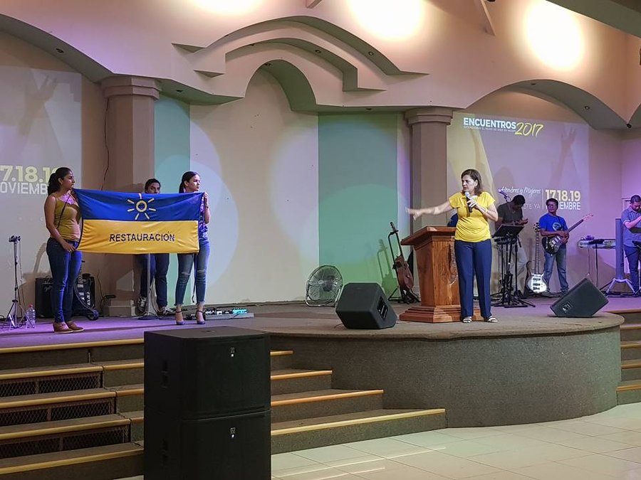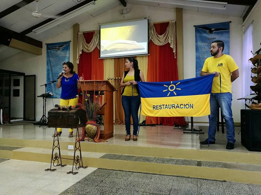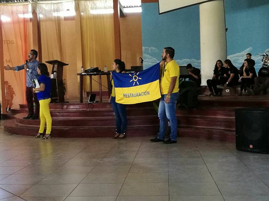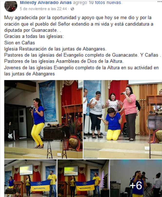 Una imagen compartida el 10 de noviembre anterior por la propia candidata a diputada en su Facebook, deja ver cómo al lado suyo aparecen dos jóvenes en el pulpito de la iglesia Oasis de Esperanza, en Nicoya, con bandera en mano de Restauración Nacional.