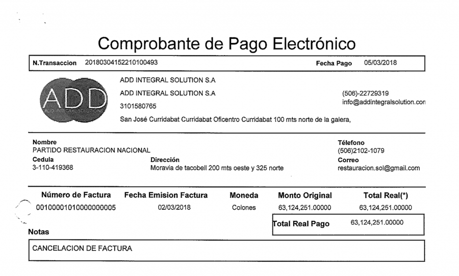 Brenes Rodríguez que fue candidata a diputada del PRN por Cartago, en el mismo proceso electoral, representa en el contrato a la empresa Add Integral Solution, la cual está ligada directamente a Luis Diego Garro, que ocupó el puesto de subtesorero del Comité Ejecutivo de partido de Avendaño, solo unos días antes de que se firmara el millonario contrato.