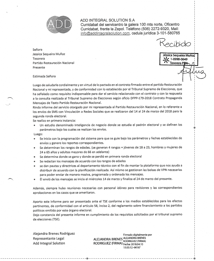 El 18 de marzo del 2018, Alejandra Brenes remite a Carlos Avendaño Calvo un primer informe denominado “Envíos de Campañas Digitales SMS-Redes Sociales” en el cual detalla todos los pormenores del supuesto envío masivo a cada uno de los costarricenses empadronados para las elecciones del 2018, es decir 3.322.329 personas.