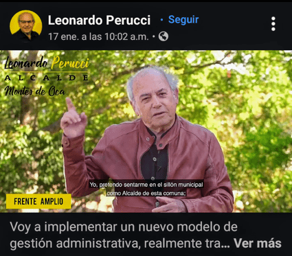 Si hay un elemento que tienen los spots políticos en contra es la ‘credibilidad’. Leonardo Perucci, candidato a alcalde por Montes de Oca dice que ejercerá su rol de funcionario municipal “caminando.” Posiblemente esta es la palabra que más se podría retener en la mente de quienes lo vean. Su promesa es desconcertante, pues en el cantón a él no se le ve en las calles. ¿Alguien lo ha visto salir a comprar leche, al menos? El conocido animador de ‘deletreando con Jacks’, actor de la Compañía Nacional de Teatro y reconocido actor de telenovelas chilenas pide, además, que le digan a -él- qué problemas tienen los montesdioqueños, “cuáles son las necesidades, cuáles son las carencias.” Esta forma de hacer política se puede traducir de la siguiente manera: Primero te escucho, luego veo cómo resuelvo.